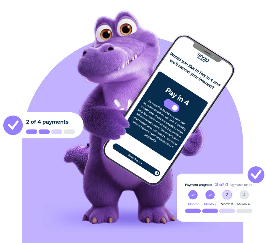 Your Snap Loan includes a Pay in 4 option. It allows you to make your purchase today and split the cost into four equal instalments.